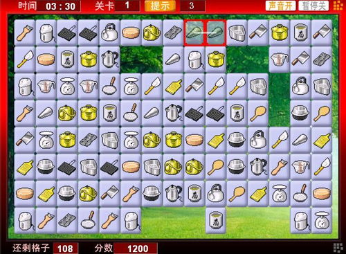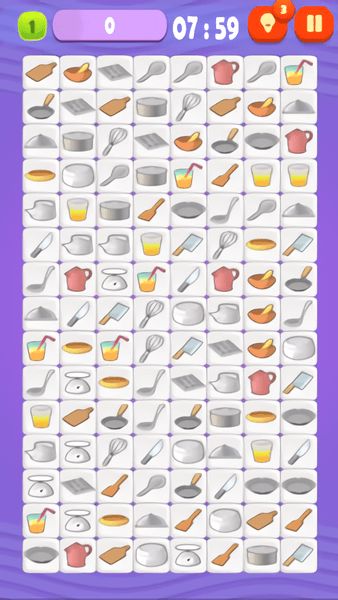 厨房连连看小游戏,顾名思义,就是在厨房的场景中,通过消除相同的物品来获得分数。游戏中的图案丰富多样,有锅碗瓢盆、水果蔬菜、米面油盐等等,每一款都充满了生活气息。当你点击任意两个相同的图案时,只要它们之间的路径没有障碍物,就可以成功消除,获得分数。